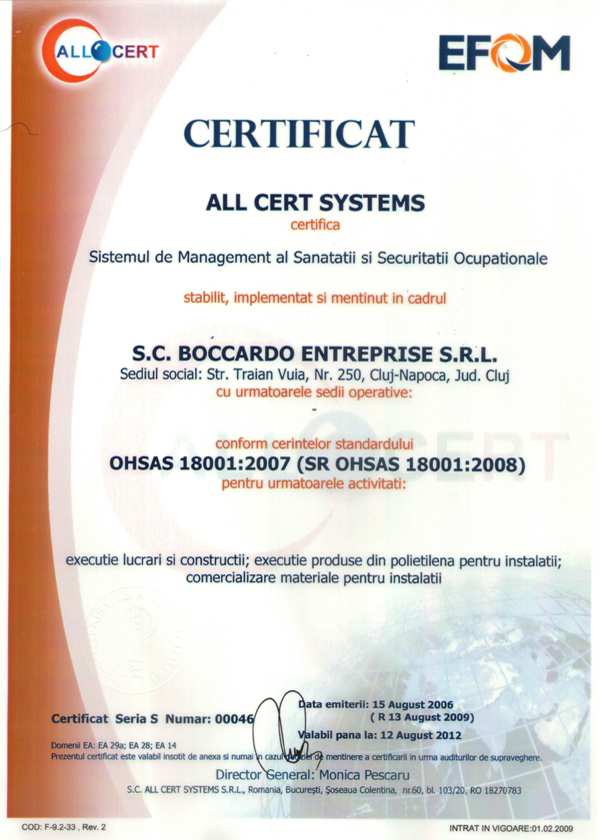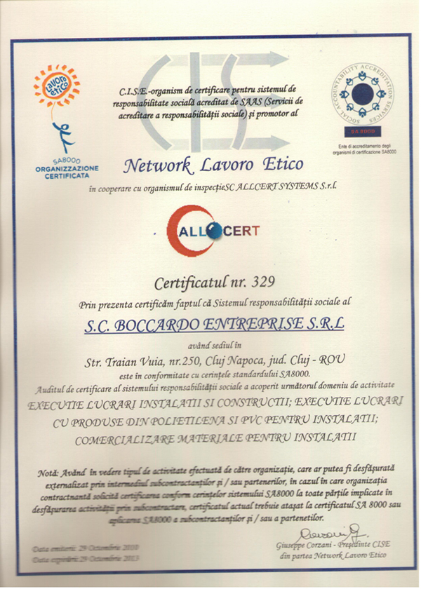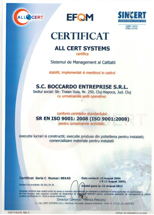 Produsele si serviciile oferite de SC Boccardo Enterprise SRL sunt garantia calitatii. Activitatea de productie si comercializare se desfasoara conform standardelor ISO in concordanta cu obiectivele noastre privind satisfacerea cerintelor clientului, asigurarea si pastrarea mediului.